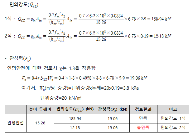 * 만약 2식의 경우라면 매뉴얼 6.1.5 (1)항은 어떤 의미인 것인지, 대부분의 조적채움벽은 전도에 대해 안전하지 못하는 것으로 생각됩니다.